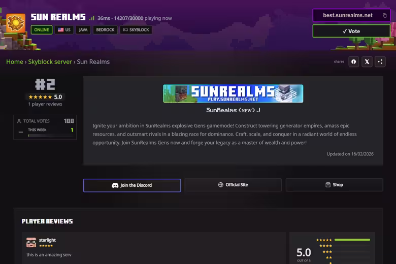 The comprehensive server details page for 'SUN REALMS', showing rich information including gamemode, real-time status, ratings, full descriptions, and even player reviews, ensuring all the context is in one place.