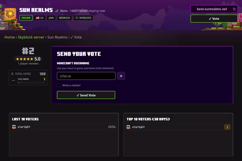 The streamlined voting process. The 'Send Your Vote' box allows players to quickly enter their Minecraft username and optionally write a review.